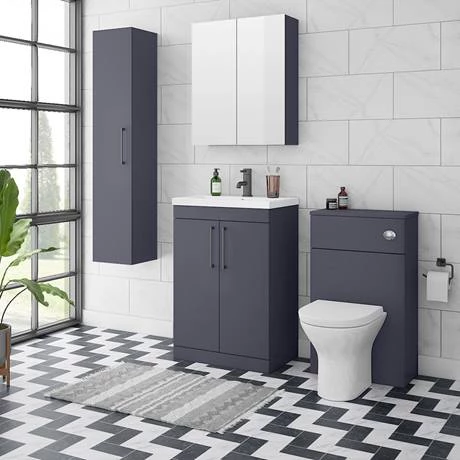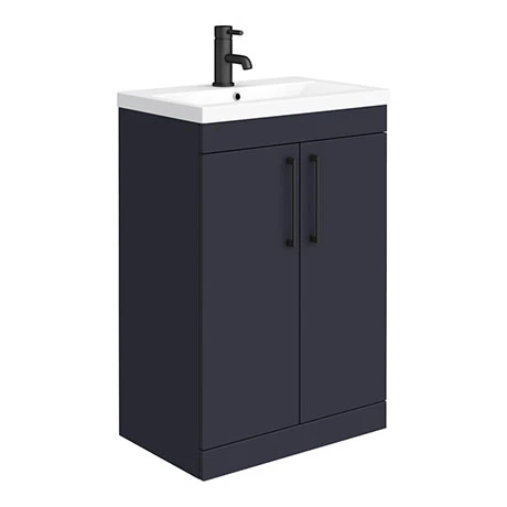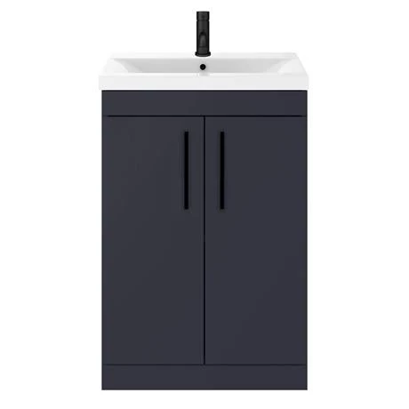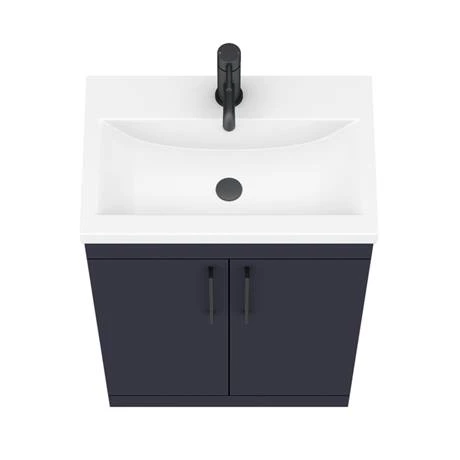 The contemporary matt blue Arezzo furniture range, with it’s clean lines this vanity unit is perfect for renewing the style in any bathroom. It’s stylish modern design hides all unsightly pipework creating a neat modern look. A internal shelf provides generous storage space for your toiletries, helping to keep your bathroom clutter free. Features a eye-catching and stylish matt blue finish with on-trend modern matt black square bar handles.Â