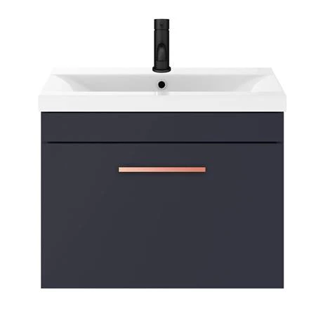 The contemporary matt blue Arezzo furniture range, with it’s clean lines this vanity unit is perfect for renewing the style in any bathroom. It’s stylish modern design hides all unsightly pipework creating a neat modern look. The units soft-closing drawer provides plenty of storage space for toiletries. Features an eye-catching and stylish matt blue finish with a on-trend minimalist rose gold square bar handle.Â