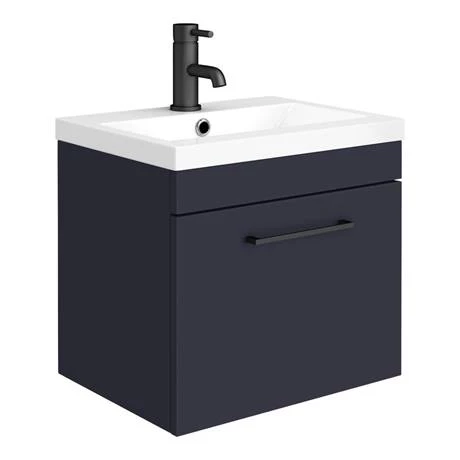 The contemporary matt blue Arezzo furniture package, with it’s clean lines this suite is perfect for renewing the style in any bathroom. The wall hung vanity unit’s stylish modern design hides all unsightly pipework creating a neat modern look. The units soft-closing drawer provides plenty of storage space for toiletries, helping to keep your bathroom clutter free. Features eye-catching and stylish matt blue finish with a on-trend contrasting modern matt black square bar handle. WC unit comes supplied with a dual flush concealed WC cistern and modern toilet with soft closing seat.
