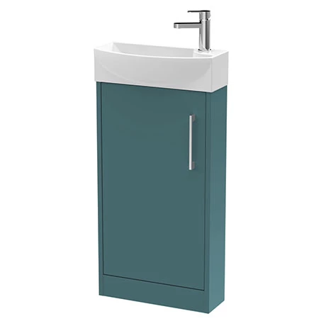 This stylish Compact Arezzo Matt Green Single Door Vanity Unit features a high quality curved ceramic basin with a single tap hole, With its graceful design it provides you with a handy space-saving solution for your cloakroom or en-suite.