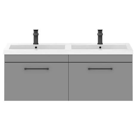 The 1205mm wide Arezzo matt grey double basin wall hung vanity unit providing space for two individuals, bring a clean modern look to your bathroom. Combines up to date looks with extra storage space, perfect for couples or families. The contemporary matt grey Arezzo furniture range, with it’s clean lines this vanity unit is perfect for renewing the style in any bathroom.Â