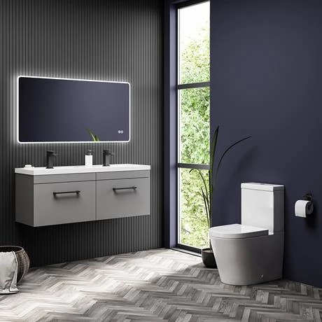 The Arezzo large double vanities’Â stylish modern design hides all unsightly pipework creating a neat modern look. The units soft-closing drawers provides plenty of storage space for toiletries. Features an eye-catching and stylish matt grey finish with on-trend minimalist matt black square bar handles.Â