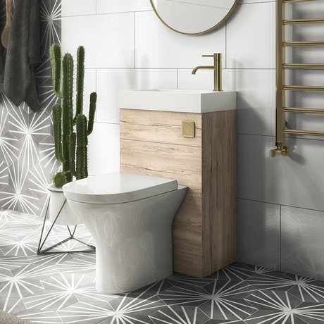Short of space in your bathroom? the Arezzo Rustic Oak Two-In-One Wash Basin and Toilet offers a stylish solution. This innovative design consists of a toilet with a sink on top – all pipework is neatly concealed inside a rustic oak textured unit with a brushed brass flush for a streamlined look. The built-in sink offers ample room for your chosen tap, while a practical soft close toilet seat shuts almost silently with a simple touch. The contemporary rustic oak effect Arezzo furniture range, displays striking distressing with knots, deep cracks and grain to recreate a natural, authentic look.