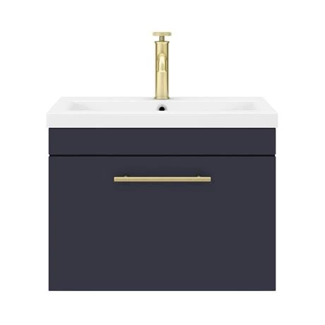 The contemporary matt blue Arezzo Industrial style furniture range, with it’s clean lines this vanity unit is perfect for renewing the style in any bathroom. It’s stylish modern design hides all unsightly pipework creating a neat modern look. The units soft-closing drawer provides plenty of storage space for toiletries. Features an eye-catching and stylish matt blue finish with a on-trend round brushed brass knurled detail handle, great for creating an eye catching industrial look in your bathroom.