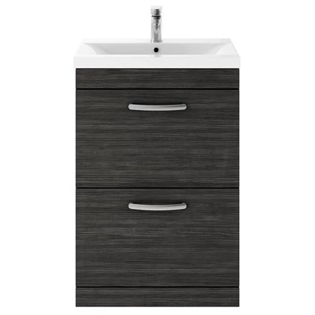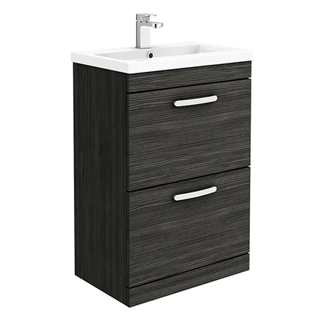 The Brooklyn modular furniture range combines up to date looks with practical storage. Features two soft close drawers and plenty of space for toiletries, the Brooklyn 610mm floor standing vanity unit is perfect for adding modern style to any bathroom. This high quality Black Woodgrain textured wood effect vanity unit is supplied with a smooth white gloss vitreous china basin.