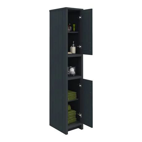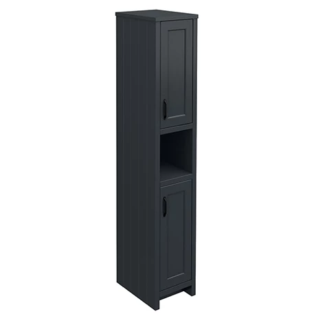 The Chatsworth traditional tall bathroom cabinet, Victorian inspired design with a modern twist. The Chatsworth range of charming bathroom furniture features classic styling with a satin graphite finish and tongue-and-groove side panelling. The soft-close function of the doors means no slamming and the cupboard boasts sturdy matt black handles.